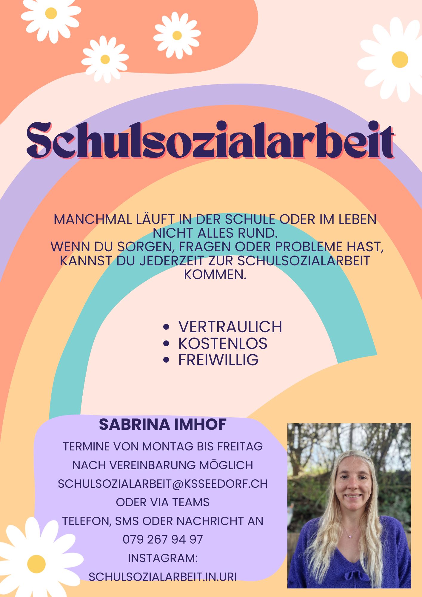 Manchmal läuft in der Schule oder im Alltag nicht alles rund. In solchen Situationen ist es gut zu wissen, dass unsere Schulsozialarbeit für die Schülerinnen und Schüler da ist. Die Schulsozialarbeit unterstützt vertraulich, kostenlos und freiwillig bei Fragen, Sorgen oder Problemen. Die Kontaktaufnahme ist einfach und unkompliziert per Mail, Teams, Telefon, SMS oder Instagram möglich. Details können dem neuen Flyer entnommen werden.