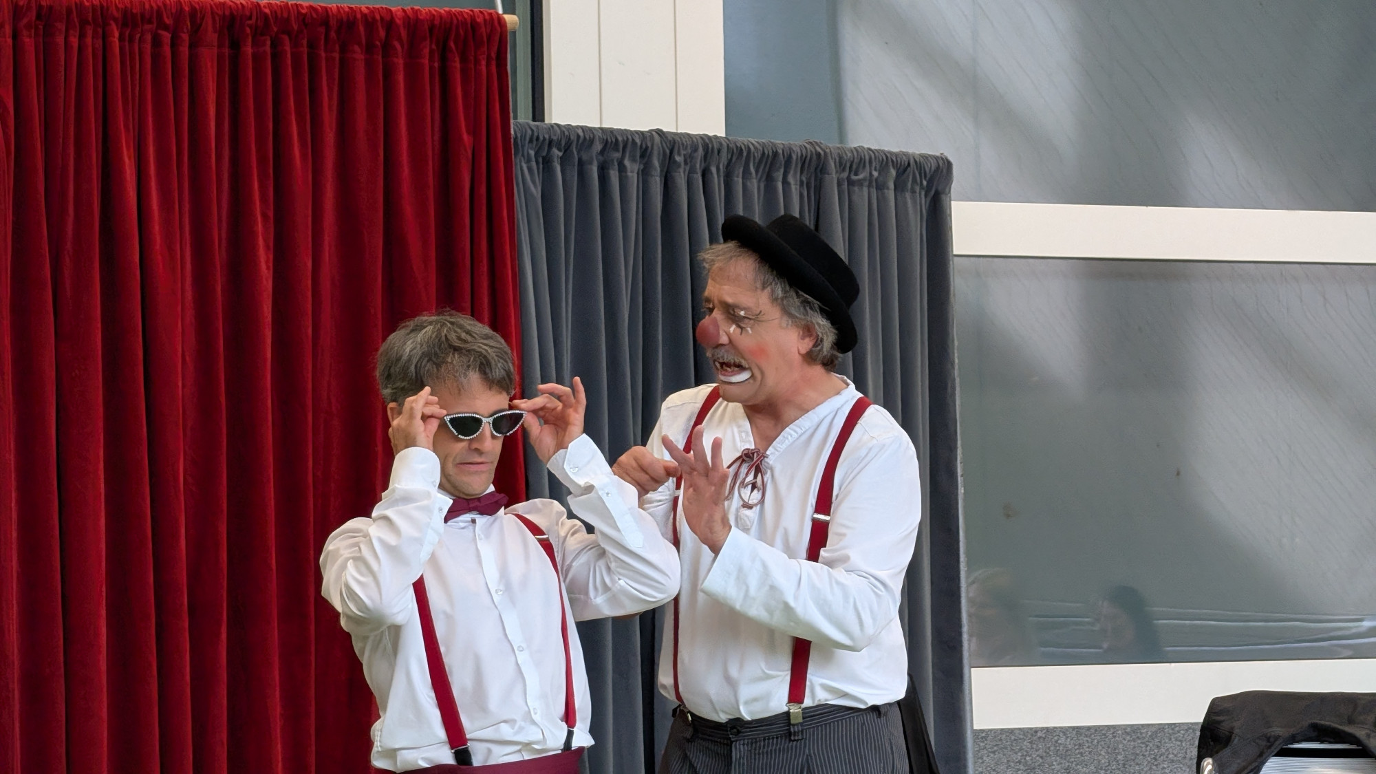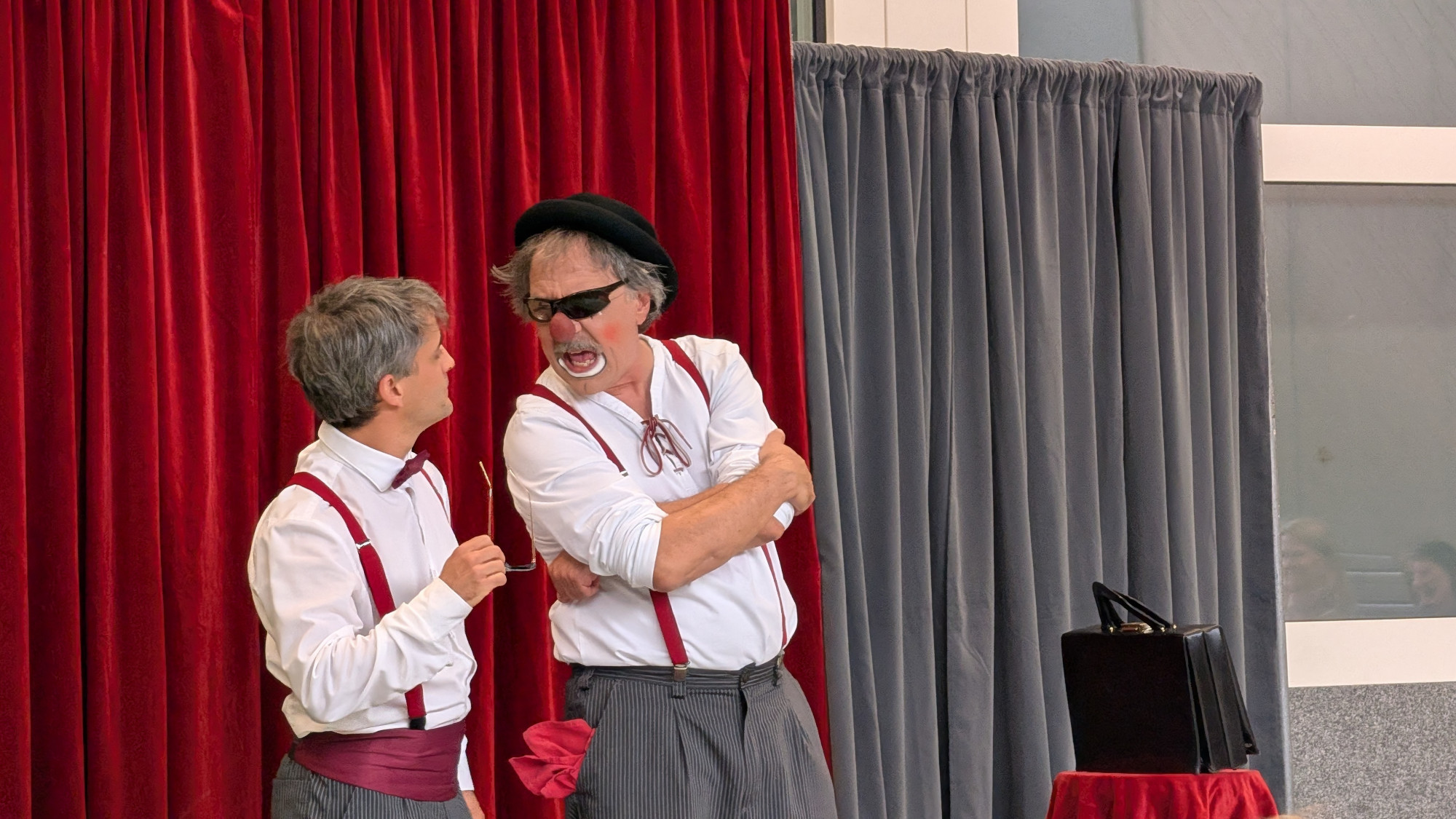 Heute kamen wir in den Genuss ihres Programms. Die beiden Clowns zelebrierten darin die hohe Kunst des Scheiterns. In atemberaubendem Tempo manövrierten sich der gewissenhafte Tommy und der begriffsstutzige Pepe gekonnt durch allerhand mögliche und unmögliche Situationen. Zauberei und Jonglage, Slapstick und Wortspielereien – all das präsentierten sie mit viel Witz, Spielfreude und Charme.